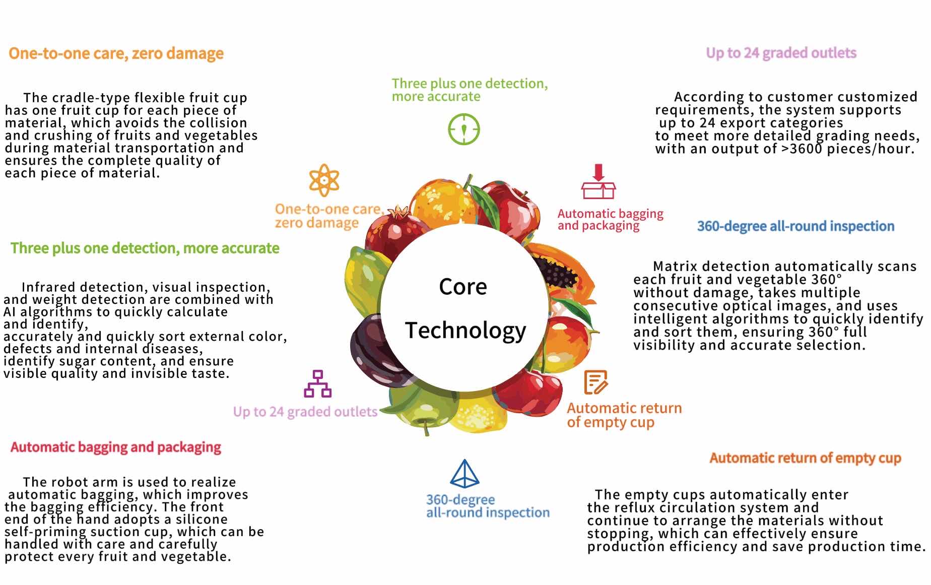 We use the newest advance tech in our sorting sorting line for help your packing house select out good quality fruits for meeting different fruit markets demand.